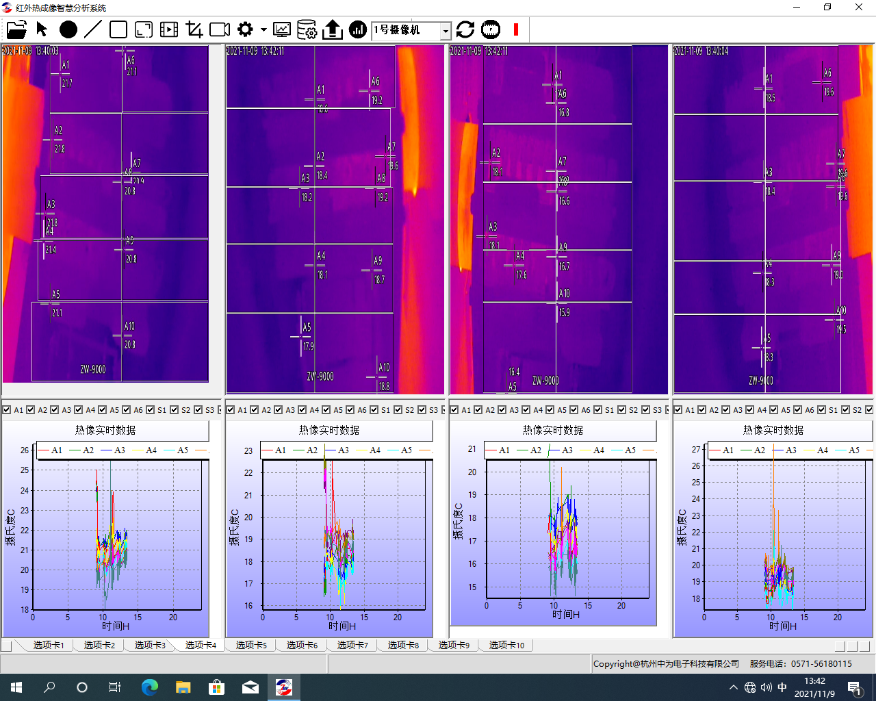 發(fā)電機(jī)碳刷在線監(jiān)測系統(tǒng)軟件預(yù)先使用多邊形區(qū)域測溫工具將重點部位框選出來,區(qū)域內(nèi)最高點溫數(shù)值及位置實時顯示,以實現(xiàn)重點部位重點監(jiān)控的目的。系統(tǒng)軟件所配置的點、線、多邊形測溫工具所框選的測溫區(qū)域都是相互獨立的,任意區(qū)域內(nèi)溫度、溫升達(dá)到其區(qū)域設(shè)置的閾值都能觸發(fā)高溫報警。