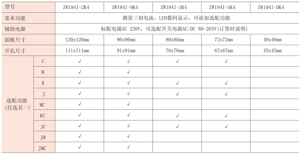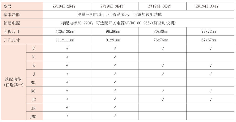 注:“√”代表可選配置,“J”代表報(bào)警輸出,“M”代表模擬量輸出,“K”代表開(kāi)關(guān)量輸入,“C”代表