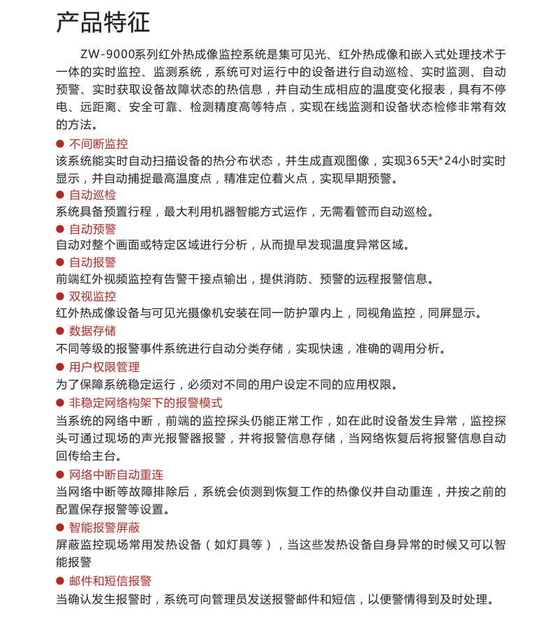 高精度多角度的紅外熱成像畫面判斷碳刷系統(tǒng)的運行狀況及周邊風溫,并實現(xiàn)報警功能;使用超大規(guī)模組網(wǎng)技術,將電廠所有紅外探測器并網(wǎng)到一個系統(tǒng)內(nèi);超前預警,對可能發(fā)生的故障信息做出超前預警;前置紅外探測器能脫離后臺獨立工作報警;內(nèi)置溫度閥值與溫升速率雙重智能報警分析算法;可預置工作狀態(tài),生成歷史溫度曲線,將工作狀態(tài)與溫度曲線重疊分析,得到不同工作狀態(tài)下的溫度特性;定時定點對設備的工作狀態(tài)做出診斷,并生成診斷報告;構建數(shù)字化、標準化、智能化的熱成像大數(shù)據(jù)平臺,提供檢測任務數(shù)據(jù)統(tǒng)計、工作報表展示、數(shù)據(jù)查詢、圖像分析、歷史趨勢分析等豐富的數(shù)據(jù)管理;熱成像技術智能化與互聯(lián)網(wǎng)化的深度融合,實現(xiàn)本地數(shù)據(jù)與云端數(shù)據(jù)的同步與共享,打破空間壁壘,實現(xiàn)巡檢任務跨地域管理;預置工作狀態(tài),生成歷史溫度曲線,將工作狀態(tài)與溫度曲線重疊分析,得到不同工作狀態(tài)下的溫度特性。